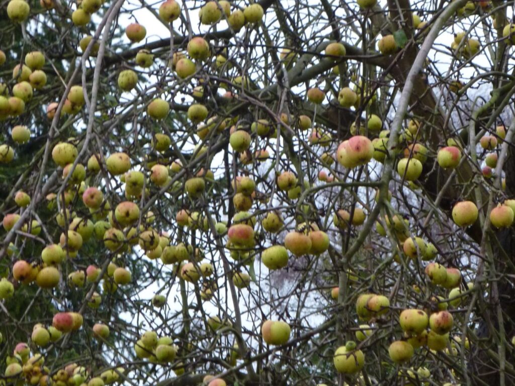 Det er ikke ofte så mange æbler bliver hængende på træet når bladene er faldet. Der er noget for fuglene at nyde. Hos paradisæbler er det meget normalt at de små frugter bliver hængende længe så vi kan nyde dem som dekorativt element i haven og fuglene har noget at leve af.