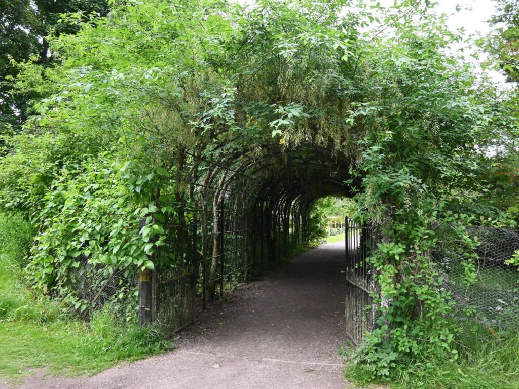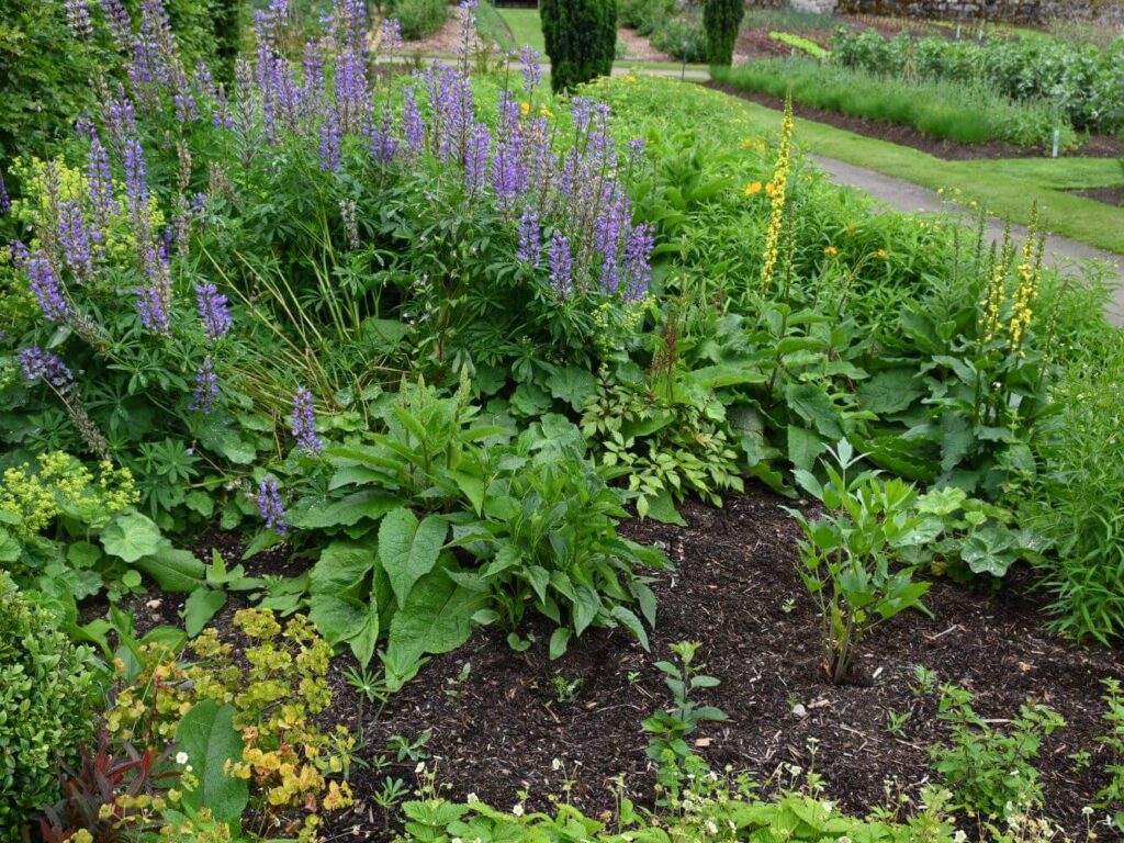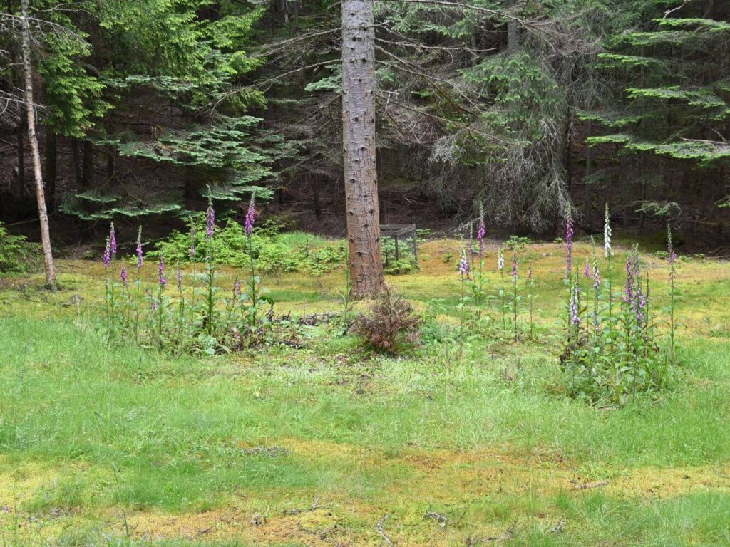 Lige ved indgangen domineres haven af 5 forskellige slags nåletræer. Fingerbøl, Digitales vokser overalt i Skotland, også her.