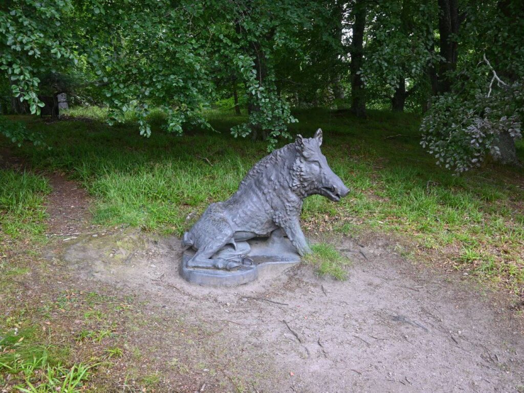Jagthytte. Læg mærke til at støttepillerne er malede stammer af nåletræer hvor grenene ikke er skåret helt ind til stammen.